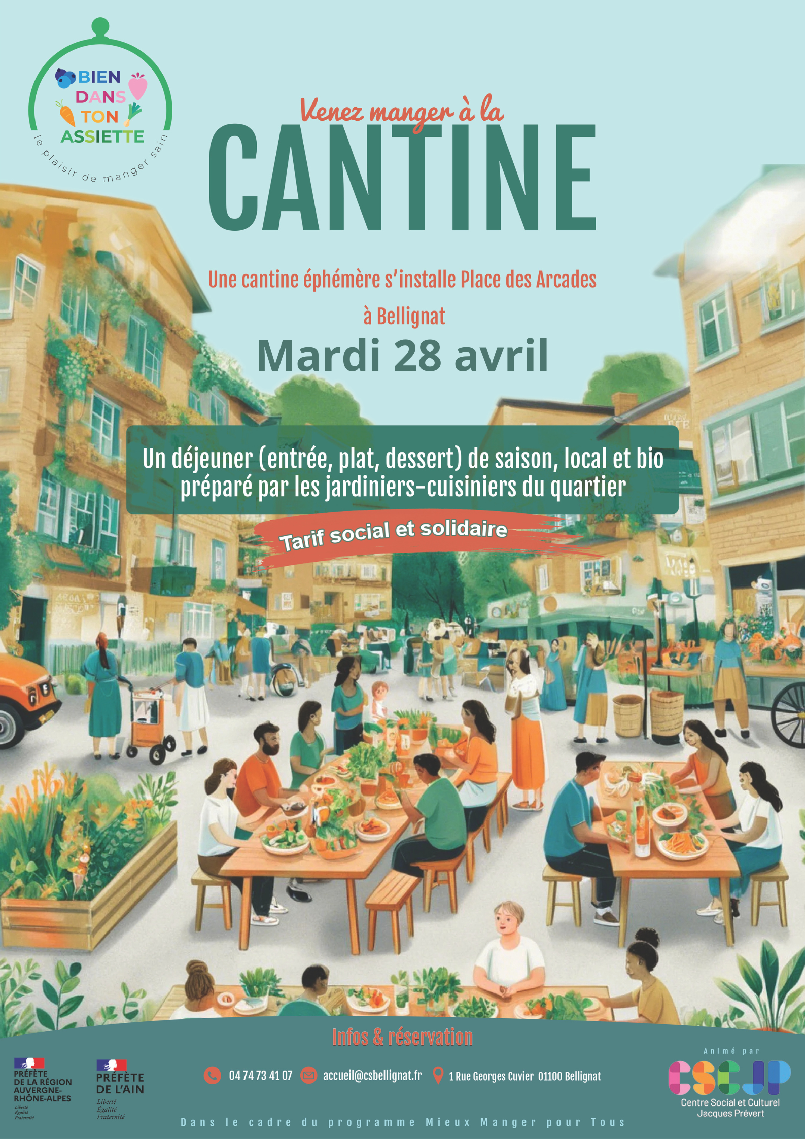 Réservations à partir du 15 mars au : 04 74 73 41 07 ou accueil@csbellignat.fr ou directement à l’accueil du CSCJP 1 rue Georges Cuvier.