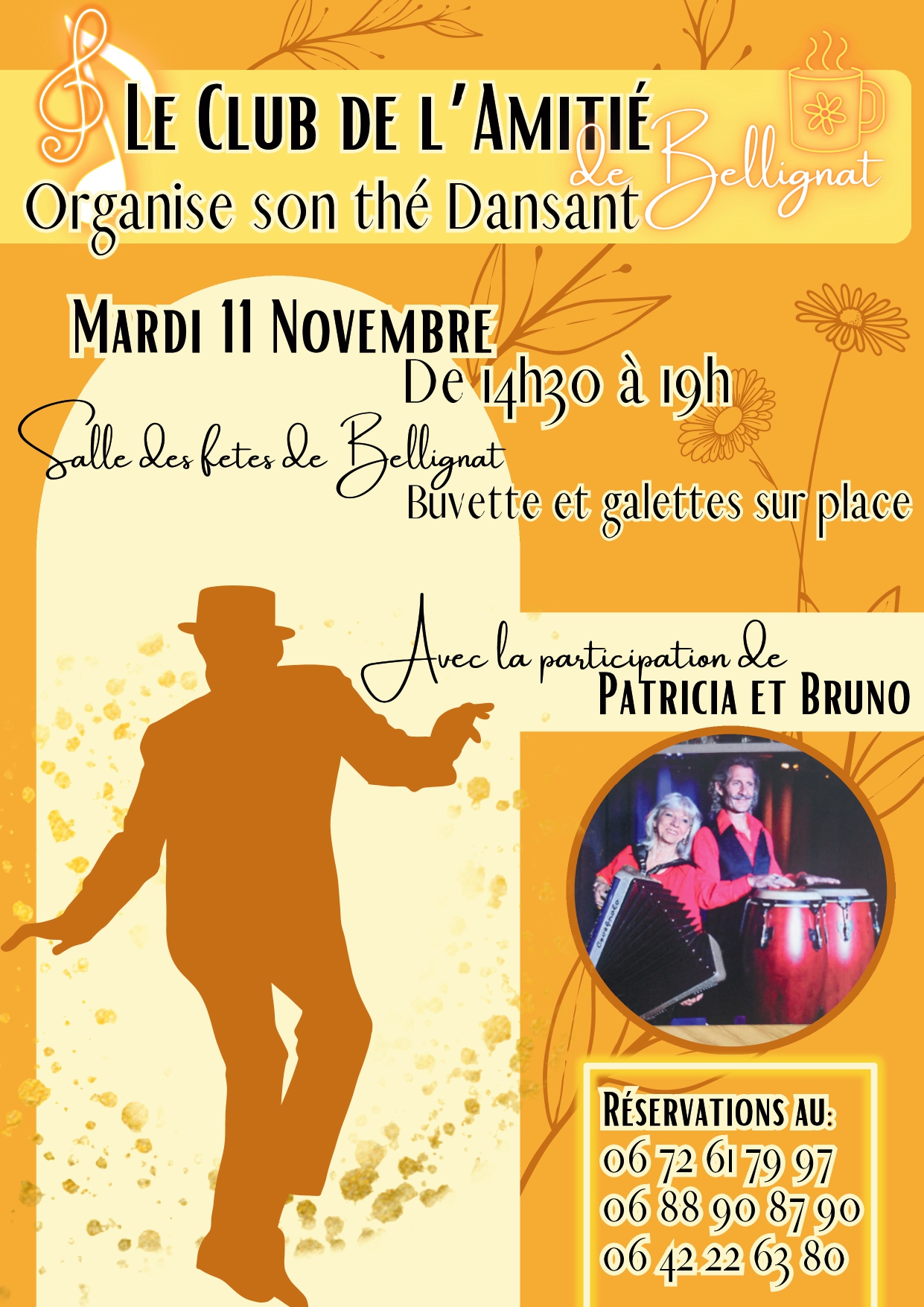 En savoir plusLe Club de l’Amitié organise son célèbre Thé Dansant à Bellignat. De la petite restauration sera sur place, et la musique sera également au rendez-vous en compagnie de Patricia et Bruno qui animeront la manifestation ! Réservation obligatoire Lieu : Salle des Fêtes de Bellignat